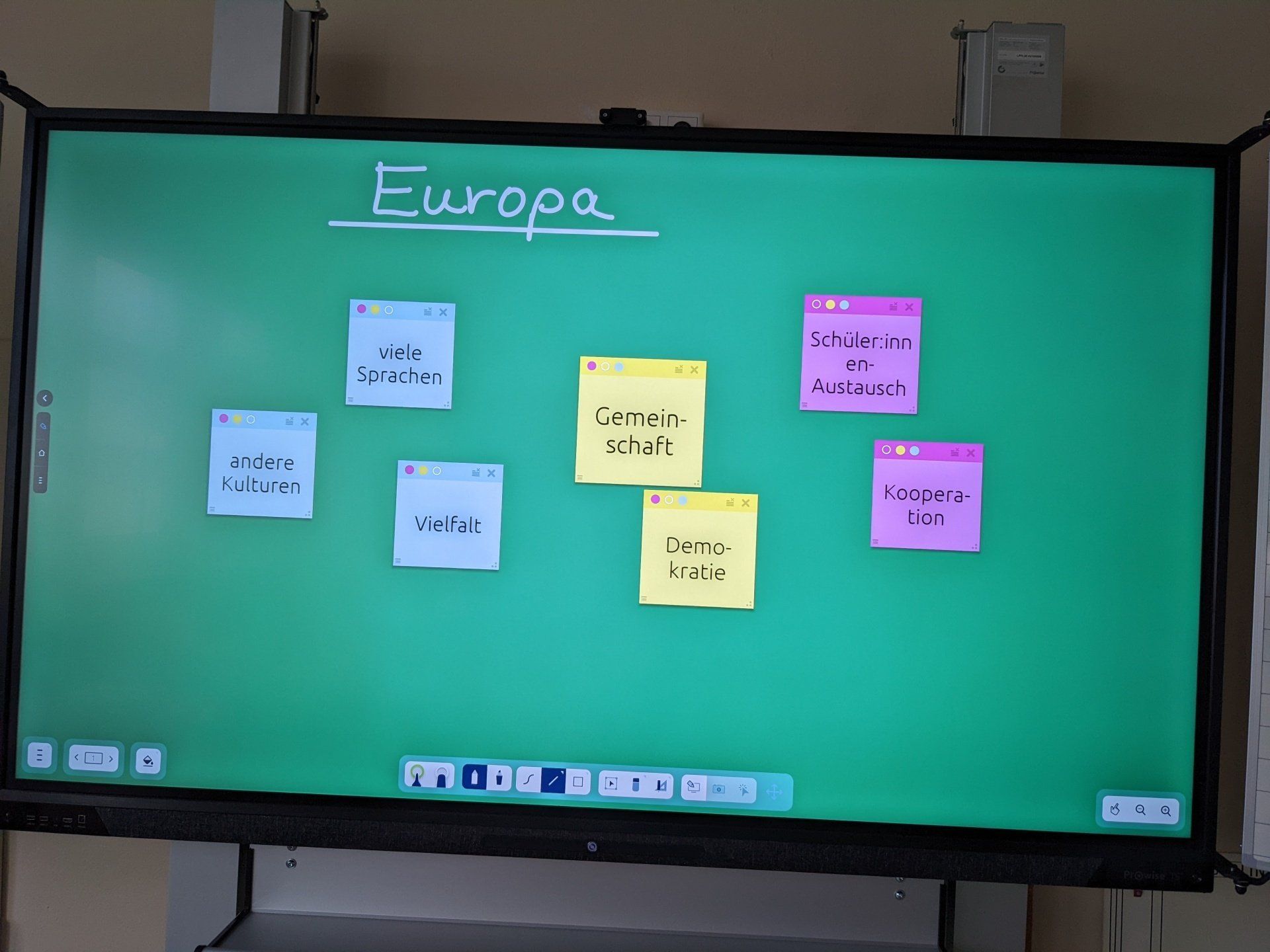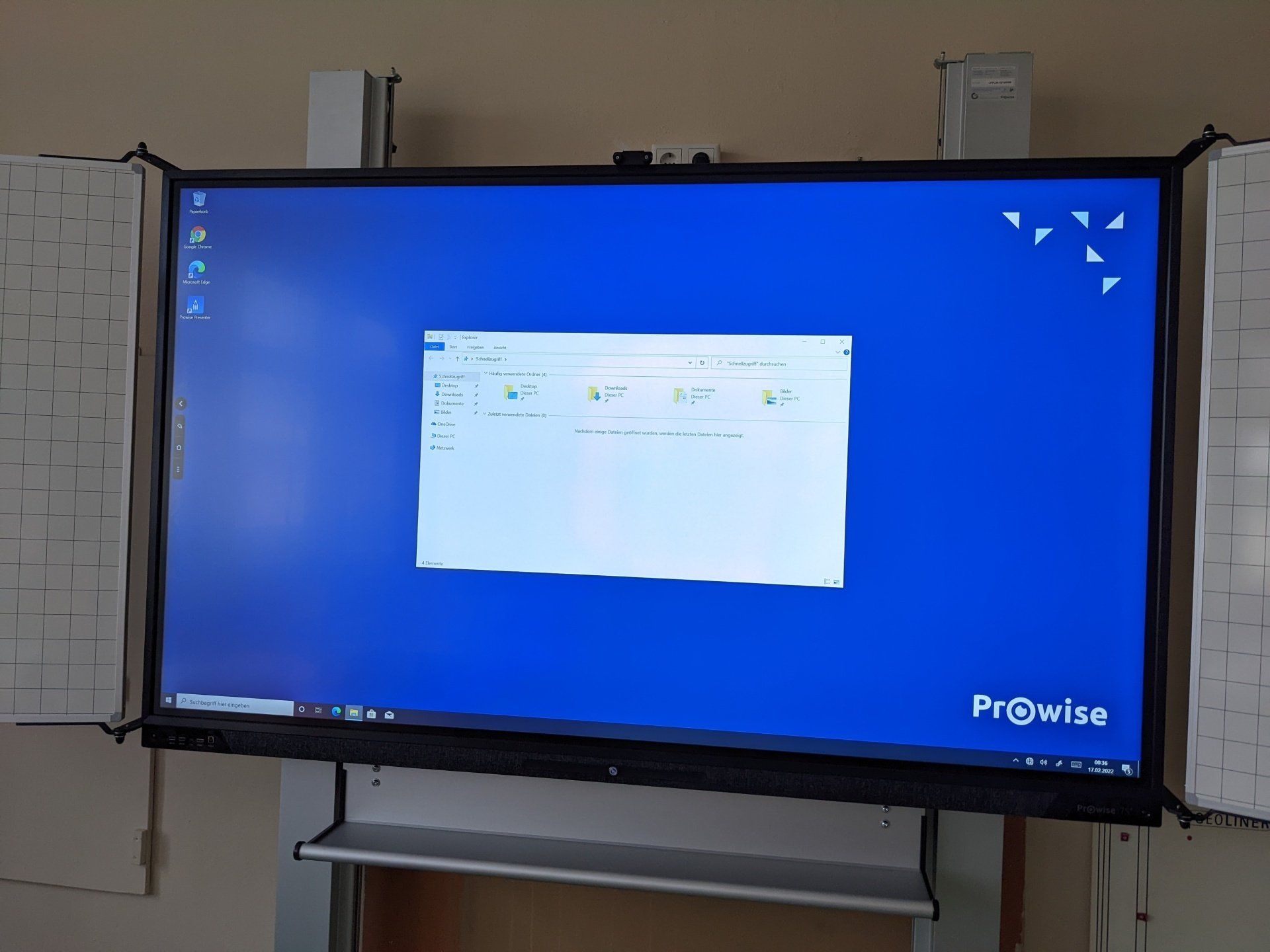 Alle Klassenräume sind mit einem Computer, einer Dokumentenkamera und einem Fernseher ausgestattet. Der Fernseher kann als digitale wie auch als analoge Tafel eingesetzt werden und ermöglicht alle Annehmlichkeiten eines Computers. Die Leher:innen-IPads und Schüler:innen-IPads können hier "gespiegelt" werden und das Ausgeben von Material kann klassenweise oder auch schüler:innenspezifisch geschehen.