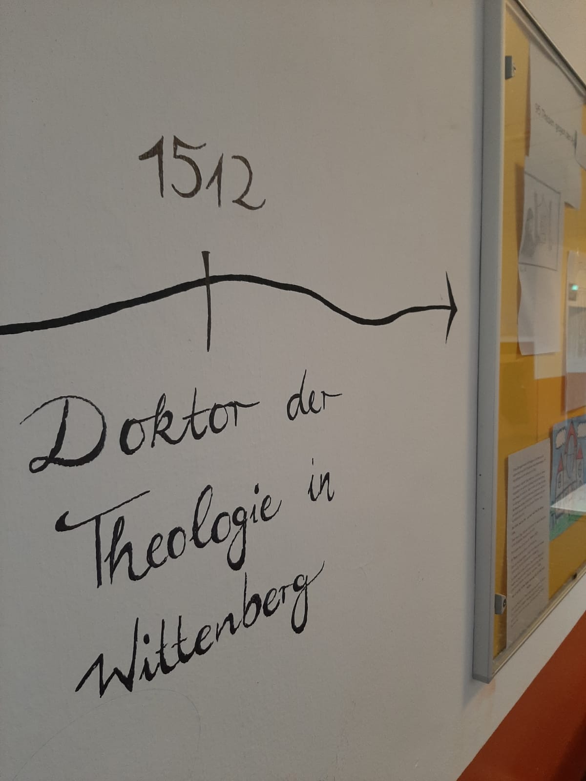 Der Namensgeber unserer Schule „Martin Luther“ begleitet die Schüler:innen auch im Schulalltag. Sie begegnen Luther beim Eintreten in das Schulgebäude und begeben sich mit ihm auf die Reise durch sein Leben. Im Eingangsbereich und in den Fluren der ersten und zweiten Etage kennzeichnet ein Zeitstrahl an der Wand die wichtigsten Ereignisse in Luthers Leben. An den entscheidenden Lebensstationen Luthers haben die Schüler:innen die Möglichkeit, sich Audiodateien über einen QR Code abzurufen. Die Audioformate werden von den Schüler:innen eingesprochen und erzählen aus Luthers Leben. In Zusammenarbeit mit den Fachschaften Kunst und Religion werden, passend zu den Lebensstationen, Bilder gestaltet. Zusätzlich werden die Schüler:innen auf dem Weg nach oben über die Treppenstufen mit bedeutenden Zitaten Luthers in die zweite Etage begleitet.